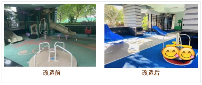 针对老旧的娱乐设施,物业服务团队将其拆除并重新添置安装,满足居民休闲需要,为居民创造更宜居的生活环境。