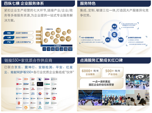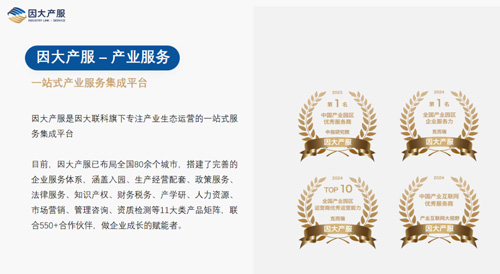 依托自有的"因大产服"团队,打造"2+4+6+N"产业服务体系。超越基础物业服务,为企业提供政策申报、法律财税、技术对接、市场拓展、投融资等全链条增值服务,赋能企业加速成长,实现共生共赢。