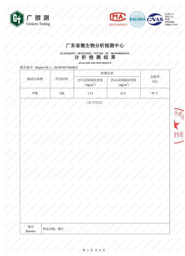 睿石是一种天然矿石,呈不规则形状。睿石经特殊工艺活化后会生成丰富的孔隙,具有发达的孔隙结构、超大的比表面积。其比表面积是活性炭的几十倍,且内部孔隙与甲醛分子大小相仿,所以睿石具备吸附甲醛等污染物的功效,能起到高效净化空气的作用。