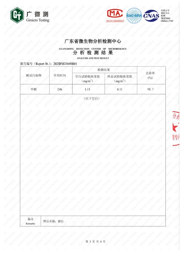 睿石能够依靠自身丰富的孔隙结构吸附空气中的甲醛、氨、苯、二甲苯、氡等室内有害气体分子,由于睿石孔隙的单向结构,睿石可以将甲醛等有害分子紧紧锁在孔隙内,不会出现饱和溢出的情况。这一特性使得睿石在持续净化能力方面表现卓越,实验室数据显示,在长达 14 天的持续测试中,睿石所在测试舱内的甲醛浓度始终保持在较低水平,除醛效率高达 95%以上。