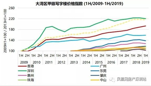 截至2019年6月,大湾区甲级写字楼租金指数环比微跌0.9%,同比增长2.4%,至172。同期,大湾区甲级写字楼价格指数环比微跌0.4%,同比下调0.5%,至216。 ...