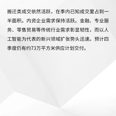 第 一太平戴维斯(Savills)发布2025第三季度中国办公楼市场回顾及展望。中国写字楼市场仍映射出宏观经济的两速格局:新经济产业迅速扩张,传统行业持续承压。科技与制造企业偏向自用或迁入产业园区,传统企业则缩减面积、寻求更高性价比。