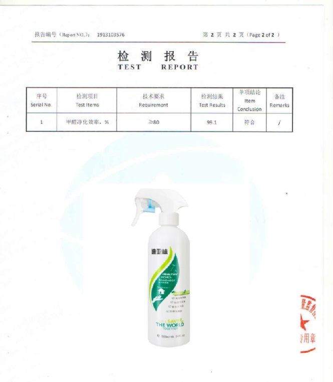 这款产品能够 24 小时深度除甲醛,无需光照,可以深入渗透板材内部,瓦解甲醛将其转化成 H20 和 CO2。并且不含氧化剂酒精和香精,环保无毒。因其高效安全的特性,被很多装修完的私人家装,医院,幼儿园,高级会所等高要求场所广泛应用于装修后甲醛的治理。