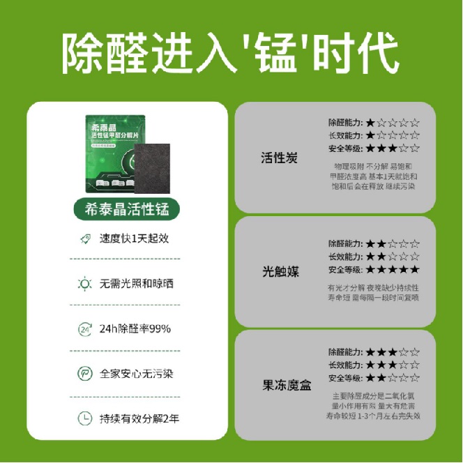 希泰晶主要是活性锰成分,有光无光均可以分解,不受条件限制。不需要光照和暴晒,可以使用2年。母婴级别有保障!甲醛去除率高达99%,是业内业内口碑非常不错的一款活性锰除甲醛产品,去甲醛效果明显且入住均可以使用,可以放心选择!