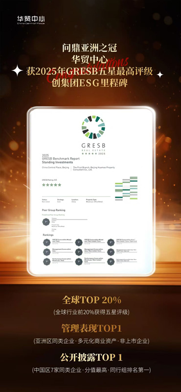 近日,全球权威的ESG(环境、社会及治理)评级机构--GRESB(格睿思)全球不动产可持续发展评级体系正式揭晓2025年度评级结果。北京华贸中心凭借凭借其在ESG领域的卓越表现与前瞻实践,首次参评即荣膺最高五星评级,不仅位列中国区同类别项目榜首,更在混合用途、内部管理与绩效等核心维度上,斩获亚洲第一的佳绩,并被授予"房地产绿色之星"称号。
