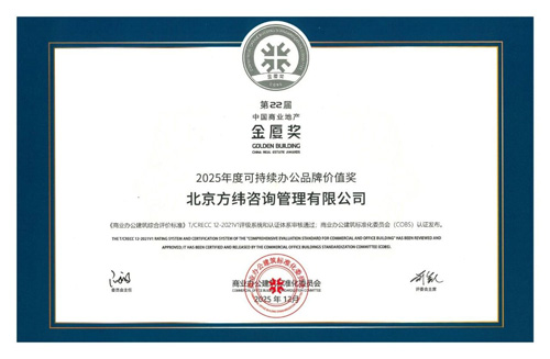 2025年12月,方纬咨询凭借在可持续办公领域的卓越实践与品牌影响力,荣膺商业地产权威奖项“金厦奖”2025年度可持续办公品牌价值奖。我司总经理李秀明先生作为代表出席颁奖晚宴。此次获奖不仅是对方纬咨询过往成果的肯定,更是推动行业绿色转型的新起点。