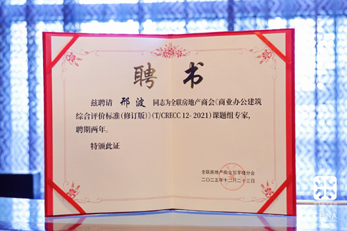 邢波被聘全联房地产商会《商业办公建筑综合评价标准(修订版)》(T/CRECC12-2021)课题组专家,特颁发荣誉证书。