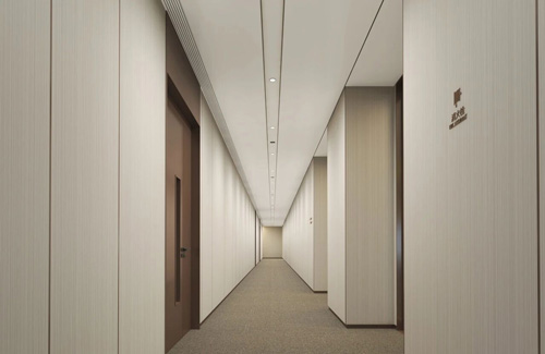 匠心品质,也延伸至维晟中心触手可及的每一处。首层大堂以10米挑高,构筑出一座 “光之殿堂”。墙面由上万块定制琉璃玻璃砖立体叠砌,在两侧灯光映照下,呈现出空灵而梦幻的光影效果。天花采用简洁的磨砂镜面与格栅设计,巧妙隐藏末端设备,将视觉焦点留给璀璨的墙面。