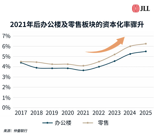 近年来,北京办公楼和零售资产的资本化率显着上升。截止2025年底,北京办公楼和零售资产的资本化率分别为5.5%和6.3%,在未来两到三年内,其资本化率仍有进一步上升的空间。
