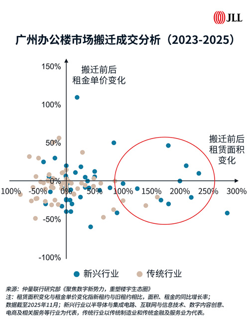 在租金回调窗口期,新兴行业正以更具竞争力的成本,入驻服务更优、产品标准更高的甲级项目。过去三年中,70%面积大增的搬迁案例来自新兴行业,且其对高品质的办公载体具备明确而切实可行的升级诉求。