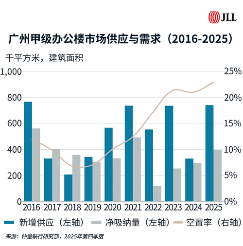 2025年,广州甲级办公楼市场在历史性供应高峰(新增供应约73.9万平方米)中持续深度调整。尽管全年净吸纳量达40万平方米,同比显着增长34%,但空置率仍同比上升2.0个百分点至22.9%,租金同比下跌9.7%,反映出整体供需压力依然显着。市场修复呈现出鲜明的结构性特征:以人工智能、数字内容、出海服务等为代表的新兴行业成长为租赁市场的重要驱动力,其扩张与升级需求正引领市场走向片区企稳与品质升级的新阶段。