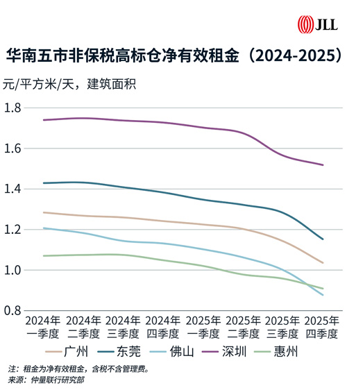 供需错配下,租户决策更趋理性审慎,业主普遍通过下调报价、延长免租期等方式促进去化,优质租户则借市场窗口期优化租约结构以锁定更优成本。受此影响,全年华南市场多数城市租金跌幅超10%,且下半年下行速度有所加快。
