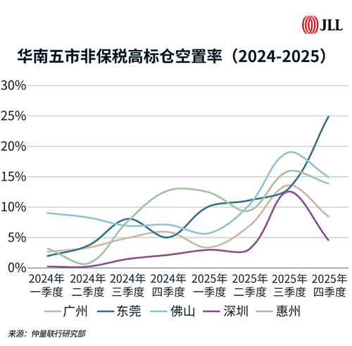 在供应端,华南五市全年非保税高标仓新增约487万平方米,创历史新高。短期供给集中入市推动整体空置率上行,部分供给较大的子市场去化滞后,空置压力突出。