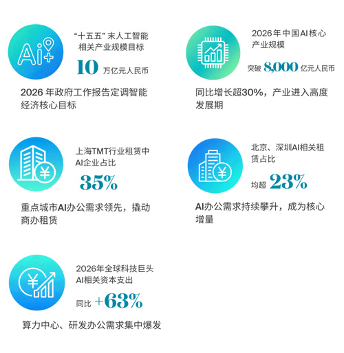 今年最受关注的是人工智能(AI)首次被纳入“打造智能经济新形态”,政府工作报告明确“十五五”末AI相关产业规模突破人民币10万亿元,2026年中国AI核心产业规模预计超人民币8,000亿元,全球科技巨头AI相关资本支出同比大增63%。从数字经济到智能经济,AI不再只是技术工具,更是重构产业体系、提升生产效率的核心变量,正从概念红利转化为实际商办需求,撬动全产业链空间需求增长。同时,地方出台的OPC政策聚焦AI赋能“一人公司”创业,在算力、空间等多方面提供支持,既解决AI产业就业问题,又催生新岗位新业态,直接利好写字楼去库存。AI产业的发展带动算法研发、算力支撑等上下游协同发展,算力中心、研发办公等全产业链空间需求全面爆发,成为商业地产最确定的增长主线 。