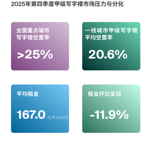当然,机会并不是在真空中出现,当前商业地产市场仍面临不小压力。全国重点城市甲级写字楼空置率已超过25%,二线城市普遍高于一线城市。2025年第四季度一线城市甲级写字楼平均空置率为20.6%,平均租金为每平方米每月人民币167.0元,环比下跌11.9%。从城市看,北京和广州空置率约为17.0%,上海约23.8%,深圳约24.6%,整体来看,市场仍处于租户占优阶段,但城市与板块间的韧性差异正在扩大。核心商务区、科技企业聚集区和具备产业导入能力的资产,抗风险能力明显更强。