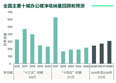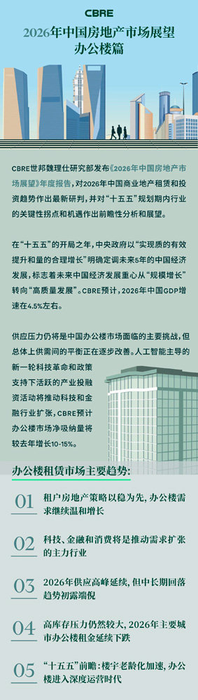 CBRE预计2026年办公楼需求将继续稳步增长,主要十城净吸纳量有望同比上涨10-15%。