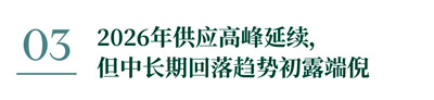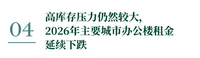 2026年市场将延续供大于求的格局,十城办公楼平均租金预计将继续下滑8%左右,大部分城市仍将面临“以价换量”的局面。作为当前唯一的空置率20%以下的市场,加之未来三年新增供应有限,北京办公楼租金降幅将在2026年显着收窄至5%以内;其他三个一线城市短期内的去化压力仍然较大,预计2026年租金跌幅将达到7-10%。