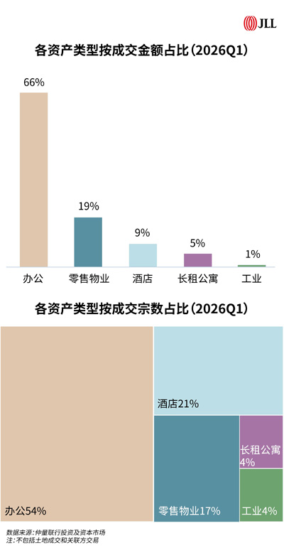 一季度,办公楼在上海大宗交易市场中占据主导地位,成交金额占比达66%,成交宗数占比为54%。其余资产类别中,酒店和零售物业的表现也较为突出。