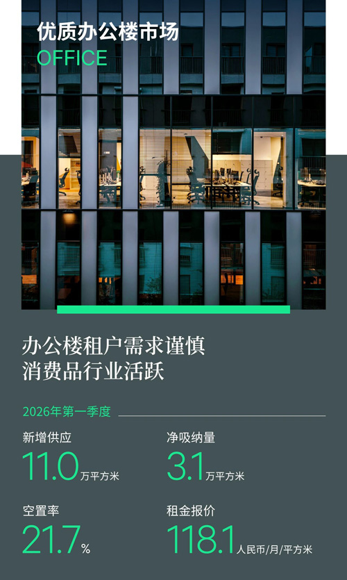 2026年首个季度,广州没有新增供应。受季内天河城百货东圃店关闭影响,全市净吸纳量录得负值。而购物中心则录得19,212平方米的空置去化,主要因为部分商场主力租户调改后引入新的电影院和超市,空置率环比小幅回落0.3个百分点至季度末的6.8%。