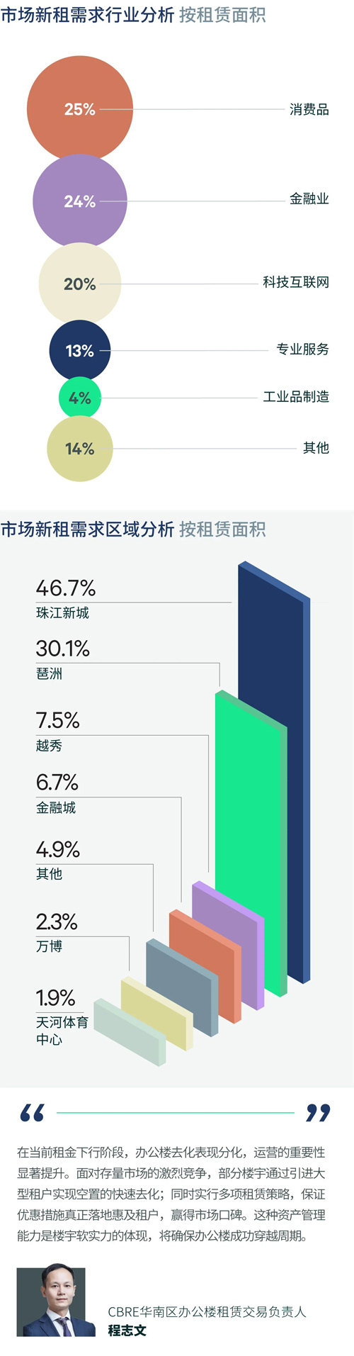 具体成交方面,消费品行业表现最为活跃,其次为金融业和科技互联网。其中,消费品行业以搬迁为主,季内录得某食品快消企业在珠江新城区内搬迁,承租约一万平方米的办公面积。金融业升级需求表现突出,57%的新租面积都是从普通楼宇搬迁到优质楼宇。证券银行分支机构表现活跃,且季内还录得某国内银行近一万平方米的新租成交,落址珠江新城。科技互联网行业成交面积环比放缓,但仍较2025年首季小幅上升3.2%。其中,该行业56%的成交位于琶洲,26%位于金融城。而当前投资热点的具身智能和服务消费机器人相关企业,都于本季录得办公楼成交。