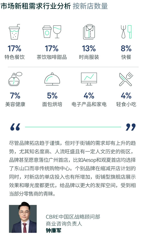 本季度新租成交中,餐饮表现更活跃,占比53.0%,其次是零售业态(36.5%)。特色餐饮和茶饮咖啡甜品类在餐饮业态中表现突出。其中,日式餐饮积极扩张,如烧烤、放题、天妇罗、拉面和寿司等,涵盖特色餐饮和快餐,中式餐饮中的江西菜也表现积极。而新茶饮也在涌现,包括上山饮茶,找茶和各种泰式茶饮。另外,天环还开设了泰国人气甜品店Cheevit Cheeva的中国首店。零售业态方面,服装品类占比最高,国内连锁品牌主要在社区拓店,聚龙湾太古里则聚集了本地潮牌新店,除此以外,优衣库本季围板了天河路正佳广场原友谊百货一楼的部分面积,而UR则在江南西扩张,在原H&M店面开设副牌——本来的新店。