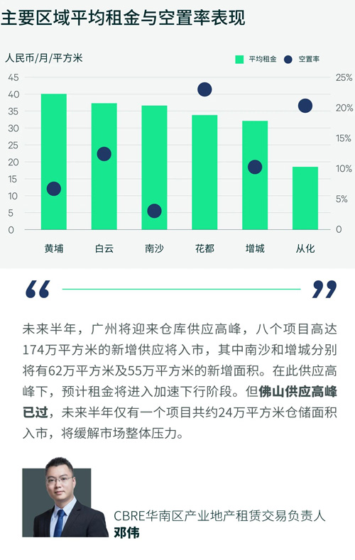 需求方面,本季度录得电商相关的第三方物流在从化扩张。另外,受区域供应增加及自建库投入使用的影响,跨境电商在大湾区调整仓库布局,退租部分广州仓库。被退租的仓库主要是非高标的物流设施,或者仓储面积较小,或租金高以及非集中分布的仓库。租金方面,以价换量态势持续,租金面价下跌幅度扩大,环比下跌2.9%至季度末的每月每平方米34.5元。除南沙外,各区租金都有不同程度下跌。其中,从化、番禺和花都的下跌,部分受跨境电商调整布局的影响;而黄埔和增城则主要受片区及周边城市供应放量影响。