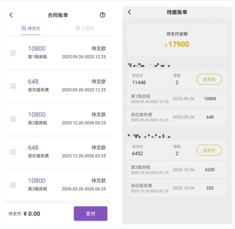 登录相寓APP → 进入合同账单页面 → 选择待缴账单