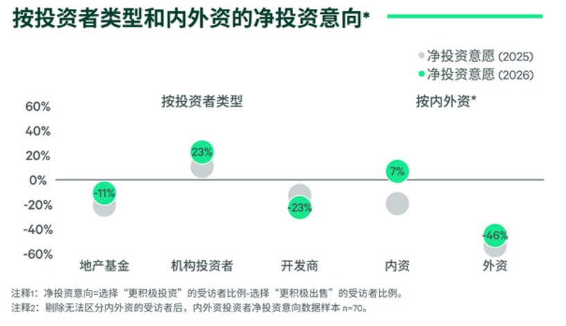 尽管整体市场仍以净出售为主导,但不同类型投资者的意向呈现分化趋势:机构投资者与地产基金的净投资意向有所回升,开发商受限于流动性压力,净出售意愿较上年进一步走强。分内外资看,在机构投资者和地产基金的推动下, 2026 年内资投资者净投资意向由负转正,而外资继续呈现净出售意愿。