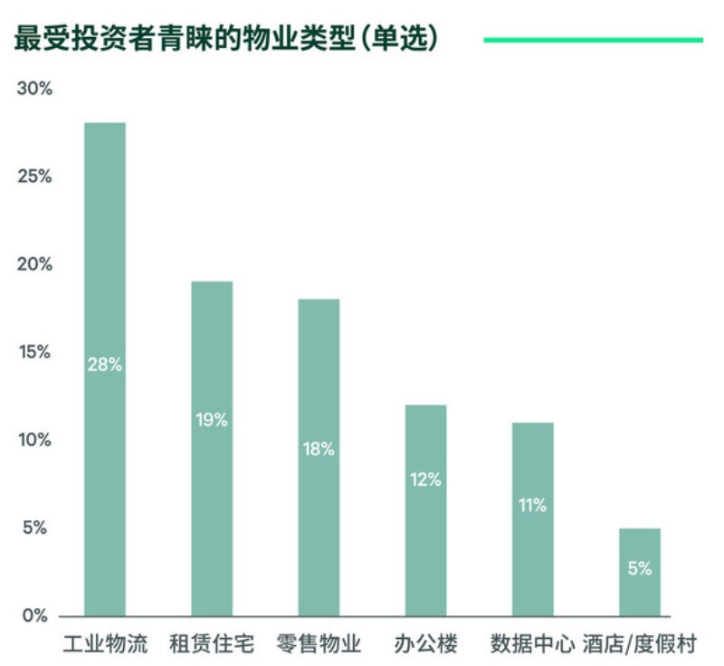 在另类资产方面,投资者偏好发生显著变化。学生公寓因国内高等教育生均宿舍面积供需缺口大,上升至关注度榜首。基础设施和生命科学地产分居第二和第三位。