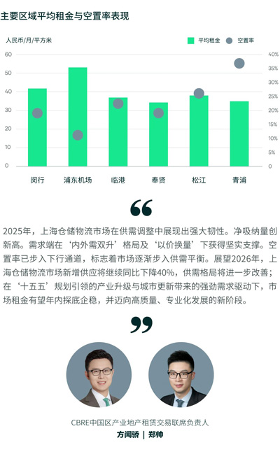 全年净吸纳量达到107万平方米,为历史新高。一方面得益于上海宏观经济持续回升向好,前三季度工业投资增长20.3%,消费品以旧换新政策持续显效拉动家具类、家用电器和音像器材类零售额同比分别增长22.1%和28.2%,尤其年中“618”及年末“双十一”大促中销量脉冲式上涨拉动仓储物流快速扩张。三方物流依然是最主要的新租动力,占比56%,主要的新增租赁来自电商平台、家电供应链企业及快递快运,集中在青浦、金山和奉贤。制造业需求在2025年呈现积极扩张态势,占比16%,持续活跃,其需求主要来源于电子通讯、汽车及零部件、以及医疗器械等行业。这背后是上海持续推进产业升级,集中在临港和浦东机场。此外,批发零售业的需求则由商场商超会员店以及积极布局全渠道销售的零售商驱动,占比14%。