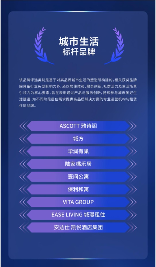 该品牌评选类别是基于对高品质城市生活的塑造所构建的。相关获奖品牌除具备行业头部影响力外,还以居住体验、服务创新、社群活力及生活场景引领力为核心要素,旨在表彰通过产品与服务创新,持续参与城市美好生活建设,为不同阶段居住需求提供高品质解决方案的专业运营机构与租赁住房品牌。