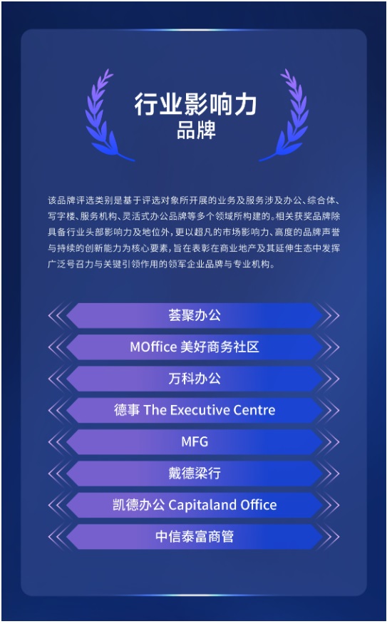 该品牌评选类别是基于企业办公全维度服务需求所构建的。相关获奖品牌除具备行业头部影响力外,还以创新服务、深度服务与无感服务为核心要素,旨在表彰通过智慧运营、场景升级与体验优化,持续提升企业效率与空间价值的优秀办公品牌与标杆项目。