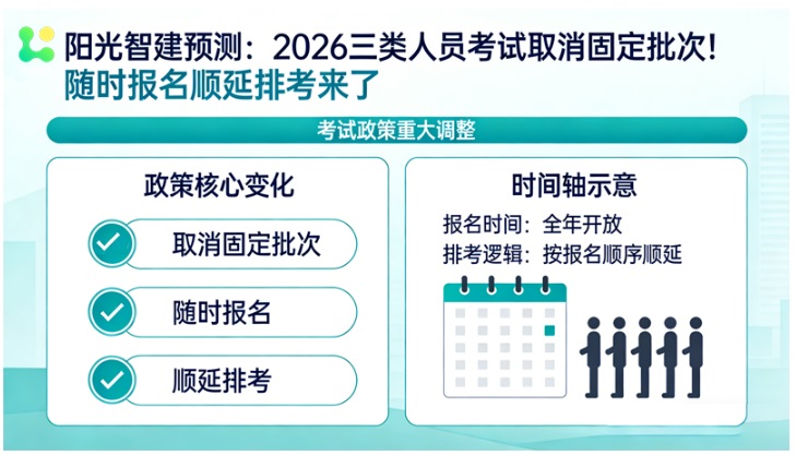 据阳光智建独家预测,三类人员考试有望全面切换全新报名系统,传统“固定批次报名、统一时间考试”模式,或将被“随时报名、按顺序顺延排考”替代。