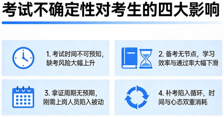 在传统批次制考试中,报名与考试时间清晰明确,考生备考有方向、拿证有预期。而新模式一旦实施,个人考证将陷入全流程被动,阳光智建三类人员考试服务团队结合过往服务经验,总结四大核心痛点: