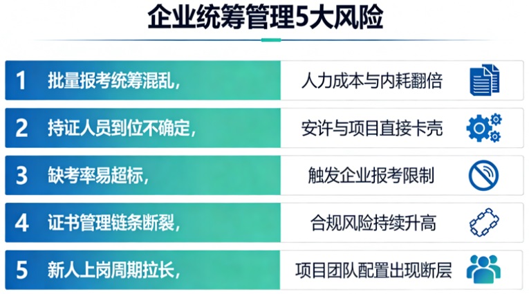 报名即享未通过免费重考至取证承诺,不受排考节奏影响,持续提供备考、报名、排考支持,彻底消除考生与企业顾虑。