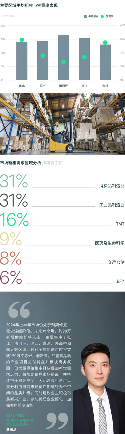 搬迁需求的持续释放仍为当前主要趋势,上半年需求占比65%。同时租户采取更保守的策略也使得续租需求有所增加。就行业方面,以科技创新为核心的新质生产力需求逐渐成为主流。首先,消费景气行情带动消费品制造业以31%占比位居租赁需求首位。主要得益于汽车企业大面积租赁活动以及多点开花的选址趋势,如小鹏汽车落址张江、麦格纳汽车技术落址临空,问界汽车和奔驰落址金桥;另录得消费品巨头利洁时和花王落址漕河泾。硬科技投资回暖带动半导体行业延续旺盛需求态势,在张江、金桥板块积极搬迁租赁,如海光芯片、芯驰科技搬迁至张江中区新项目。同时也录得多家装备制造类企业需求,因此工业品制造业以31%占比位居需求第二。TMT企业需求相比有所减弱,上半年需求占比16%位居第三。但人工智能及软件系统开发类新兴企业表现亮眼,呈现扩租及升级搬迁需求,其中不乏涉及人工智能算力、大模型等前沿企业。