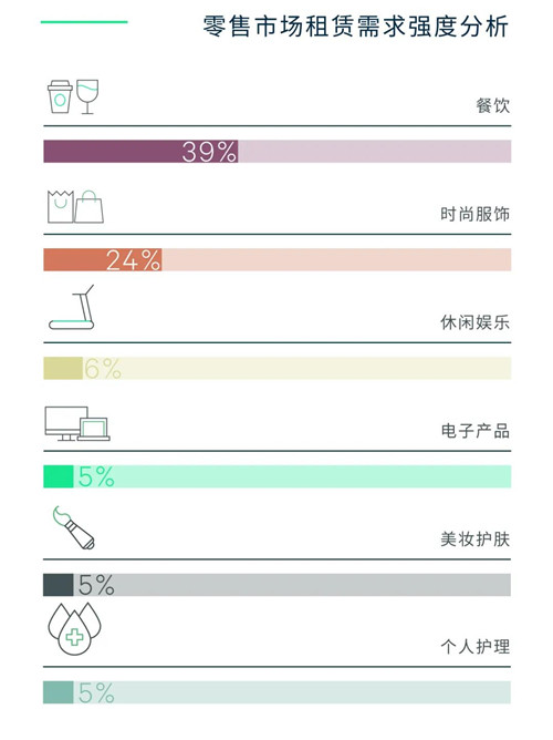 餐饮依旧是当前主力需求,占比39%。从餐饮类细分品牌上看,半数来自于中式餐饮,如马记永、松鹤楼苏式汤面以及添好运等类扩张较快。其次,咖啡茶饮以及烘焙甜品品牌积极布点,本季多家国潮糕点品牌首进上海,如“山海茶点”与“虎头局渣打饼行”。此外,“CITY MART 城市集市”这类新兴美食集市持续为新项目打造热点、增加线上流量。从北外滩来福士的城市集市·里弄到太阳宫的城市集市·江湖,鲜明的主题和极具特色的场景设计克服了传统美食城的同质化缺陷,丰富消费者场景化体验,争相成为打卡圣地。时尚品类占比24%,其中女装与运动品牌需求较为亮眼,如专业户外运动品牌HOKA ONE ONE中国首店进驻静安嘉里中心。截至季末,全市空置率环比小幅上升0.1百分点至7.0%,全市购物中心首层租金环比增长1.0%至人民币每天每平方米34.9元。