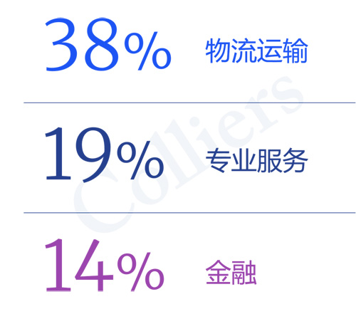近几个季度以来,物流企业租赁活跃度持续提升,本季度部分头部企业因进行大面积搬迁,贡献了显着的租赁成交量,推动物流行业跃居需求来源首位。专业服务(19%)与金融(14%)则分别位列第二和第三位。