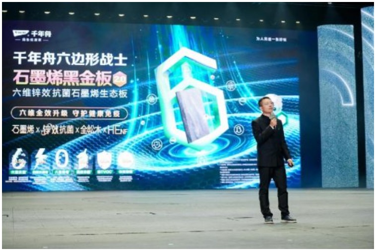 千年舟创研的石墨烯黑金板,运用航天级科技石墨烯材料,实现99.99%高效抗菌率、99.9%抗病毒活性率,还具有0级防霉标准、净醛、除TVOC功能。此次发布会上推出2.0版本,在原有基础上迭代升级,增加“除螨”“抗宠物病毒”两大功能,螨虫驱避率>60%,打造真正的“六边形战士”。