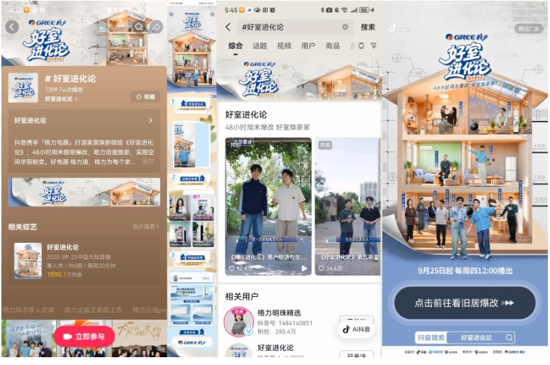 为打通 “观看—种草—消费” 的关键链路,「好室进化论」IP特别打造H5专题页面,最大化承接全站热度,将内容价值高效转化为商业价值。专题页作为微综播放入口,支持用户随时回看节目精彩片段;同时整合达人种草专区,集中展示格力产品在真实场景中的使用效果;最后设置 “同款选购” 通道,用户可直接跳转购买微综中出现的新国标全能王空调、505荔枝冰箱、鲸涛锌矿净水机等产品。另外,节目依托抖音平台强大的流量资源,通过话题页、开屏广告、阿拉丁推荐、H5等多渠道全方位导流,最大化覆盖目标受众。
