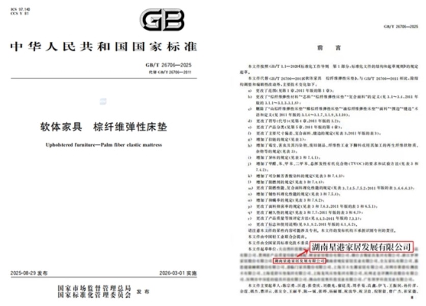 《GB/T 26706-2025 软体家具 棕纤维弹性床垫》国家标准的实施,为行业划定了明确的起跑线,而星港家居不仅是规则的遵循者,更是规则的共同制定者与品质的先行者。