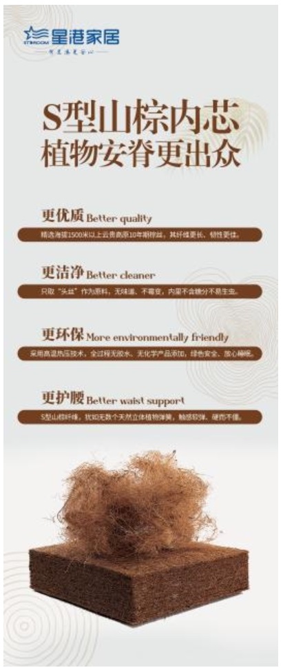 · 源头之选,定义更优质的支撑:星港棕床垫坚定地选用S型山棕,精选海拔1500米以上云贵高原10年期棕丝。这些生长周期长的纤维更长、韧性更佳。星港更极致地只取“头丝”作为原料,确保内里不含糖分,从根源上实现无味道、不霉变、不易生虫的洁净品质。