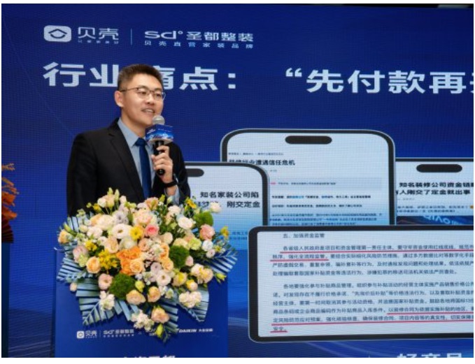 在发布会现场,贝壳整装对外关系与发展中心总经理郑深圳在发言中系统性阐述了资金存管服务的核心价值。他介绍到,资金存管在形式上是一项服务,但本质上是构建与消费者的信任纽带,其“满意再付款”的朴素理念直击装修行业预付模式下的资金风险痛点。郑深圳指出,贝壳之所以能率先在家装领域推行此项服务,源于其“对客户好”的基因与在居住领域积累的深厚能力。他强调,推行资金存管的核心在于“将选择权交还给消费者”,这不仅是企业服务的创新,更是推动行业建立基本信任线、走向规范透明的重要实践。