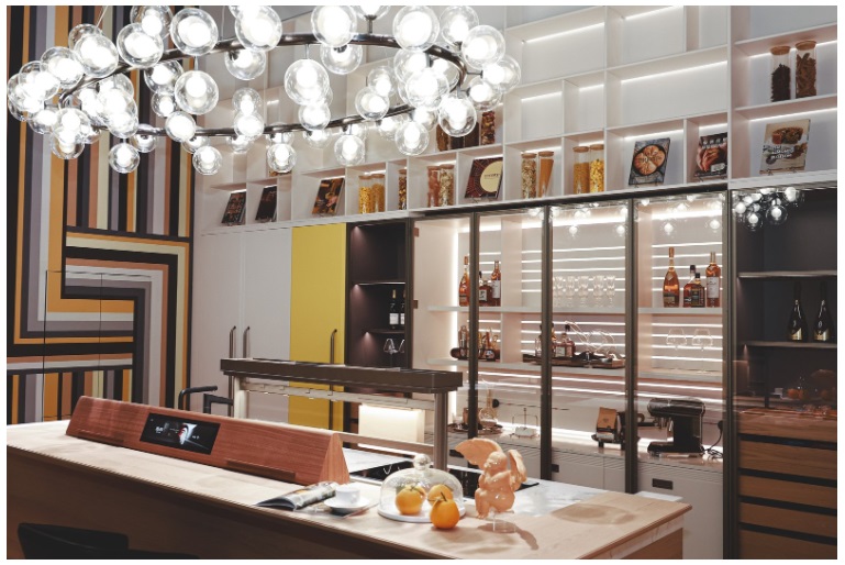 语音即可启动方太蒸烤程序、系统识别食材储存与保鲜状态;推送菜谱搭配与饮食建议,让厨房从功能场所,升级为家庭的能量源。厨房岛台配置智能升降系统且支持隔空触控,可以放置烹饪料理工具、酒杯等,用时显形,触手可及;不用时隐藏,岛台整洁美观。流影门板通过平行光线条创造动态美感;智能照明根据使用场景自动调节光效,从备餐的明亮到休闲的柔和,在晨昏流转间,烹饪成为充满仪式感的创造体验。