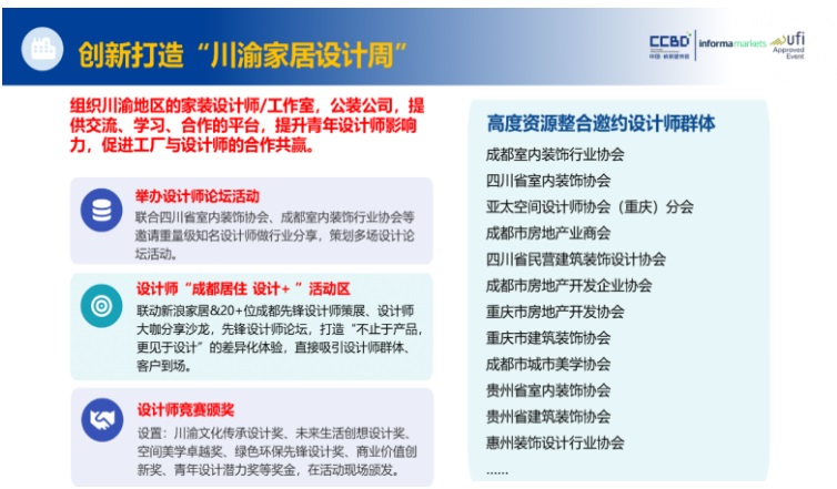 设计重塑空间,美学赋能产业。作为“设计之都”,成都汇聚了西南地区67%的知名设计机构,创意资源富集。2026中国成都建博会创新打造“川渝家居设计周”,联合重庆市建筑装饰协会、亚太设计师协会重庆分会、成都市建筑装饰协会、四川省室内装饰协会、成都室内装饰行业协会等权威机构,策划多场设计主题展与专业论坛,推动设计价值向产业价值高效转化。