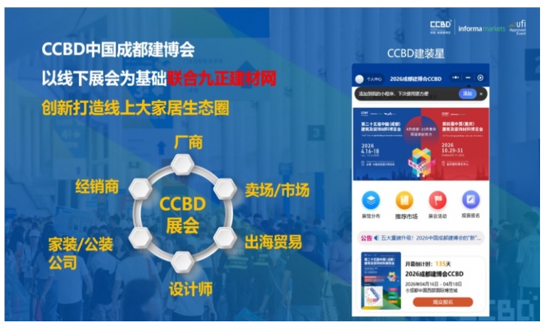 AI、大数据等数字技术加速渗透,推动展贸模式迭代升级,线上展厅成为行业发展新趋势。2026中国成都建博会主动拥抱变革,与九正建材网达成深度战略合作,联袂打造数字化平台【CCBD建装星】,构建线上线下融合的大家居行业新生态。