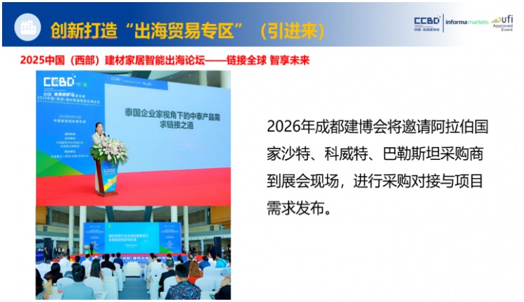 国家“一带一路”倡议持续推进,为企业出海贸易注入强劲动力。2025年一季度,我国货物贸易进出口总值同比增长1.3%,企业“走出去”的需求愈发迫切。2026中国成都建博会顺势而为,创新打造出海贸易专区,并举办系列出海论坛活动,搭建中国企业与国际市场的高效对接桥梁。