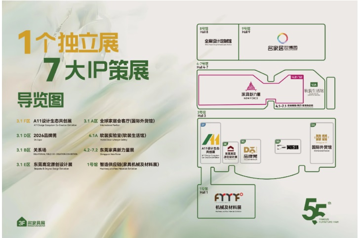 名家居世博园、全案设计定制馆以及国际家居名店街,分别作为第55届国际名家具(东莞)展览会的9号馆、8号馆以及主题街区,完成从“展贸一体”向“超级生态平台”的战略跃迁。