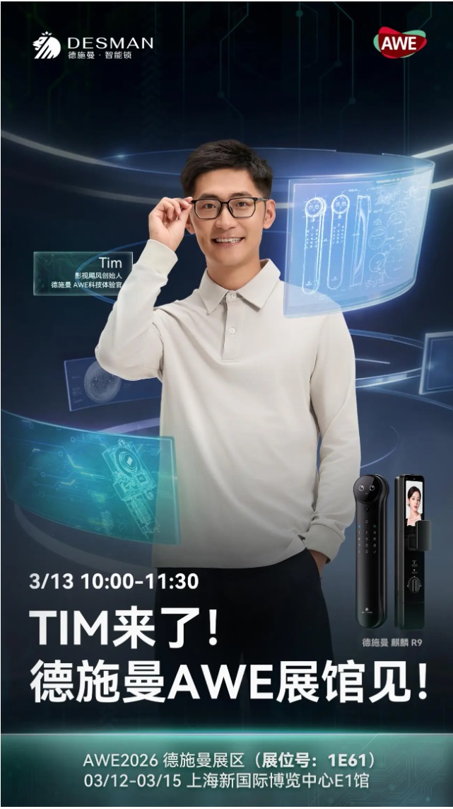 AWE展会期间,影视飓风创始人Tim将亲临德施曼展位进行实地探馆,并带来深度对谈。Tim将带领观众全方位体验德施曼AI智能锁的创新场景,解读技术背后的温度与匠心。