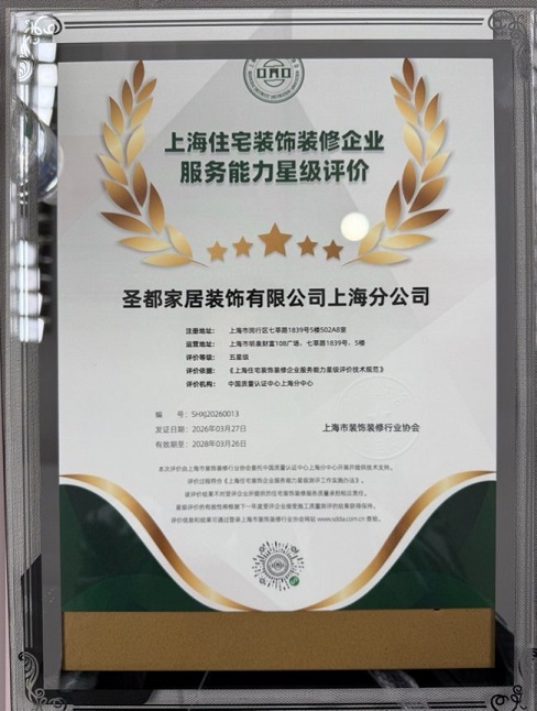 此次荣膺五星级企业称号,是上海圣都整装发展历程中的重要里程碑,更是行业赋予的全新使命。未来,上海圣都整装将以此次五星评定为新起点,持续坚守品质初心与服务本心,不断升级施工工艺、优化服务体系、强化品控管理,始终以高标准要求自身,持续为上海业主提供省心、放心、安心的一站式整装服务,助力上海住宅装饰行业高质量发展,为更多家庭筑造温馨、舒适、高品质的理想居所。